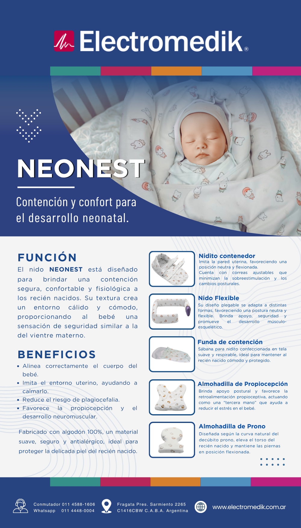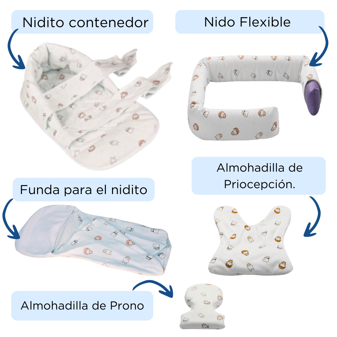 Nidito contenedor: Imita la pared uterina, favoreciendo una posición neutra y flexionada. Cuenta con correas ajustables que minimizan la sobreestimulación y los cambios posturales.