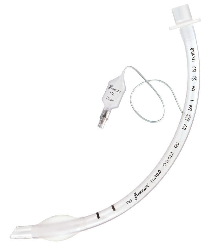 Tamaño 9. Oral/curvo, balón convencional. Tubo endotraqueal de balón redondeado que maneja mayor presión para intubaciones seguras a corto plazo, provisto de una guía de profundidad de línea doble, línea radiopaca de alta resolución y balón piloto que identifica el tamaño y comprueba que esté inflado. Es resistente a las deformaciones pero con el calor del tejido se moldea mejor a la anotomía del paciente. En su punta redondeada, biselada y atraumática se puede observar una segunda apertura como salvaguarda en caso de bloqueos, llamada Ojo de Murphy.