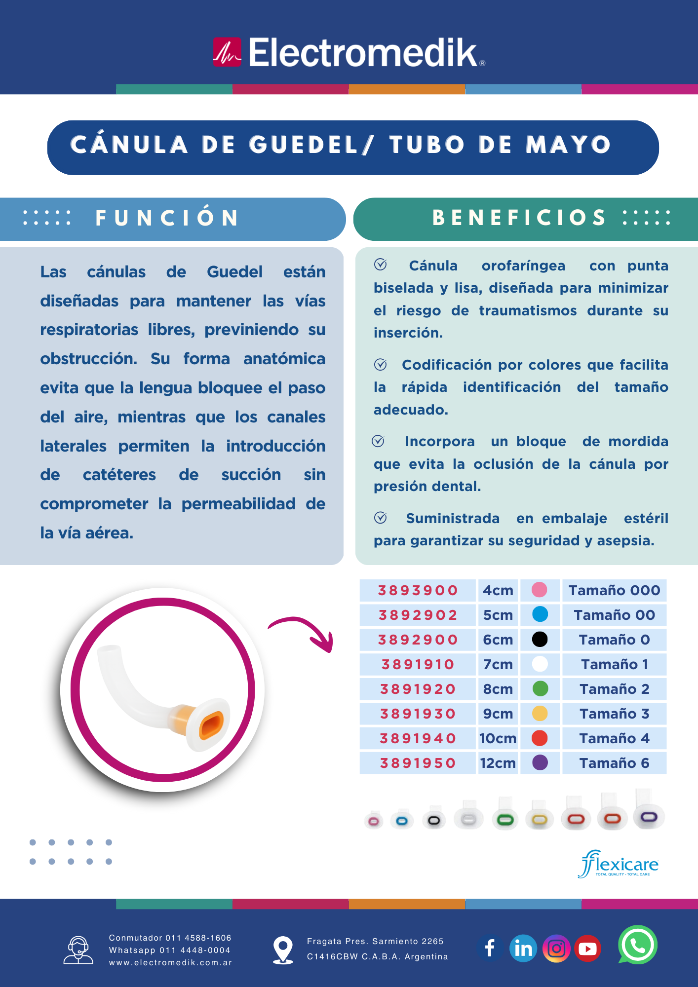 Cánula de vía aérea orofaríngea Guedel Flexicare, diseñada para mantener el flujo de aire libre y proteger las vías respiratorias evitando la oclusión por la lengua. Cuenta con canales laterales que permiten el uso de catéteres de succión sin obstruir la vía aérea, punta biselada y lisa para reducir traumatismos, bloque de mordida integrado y codificación por colores para identificar fácilmente el tamaño.