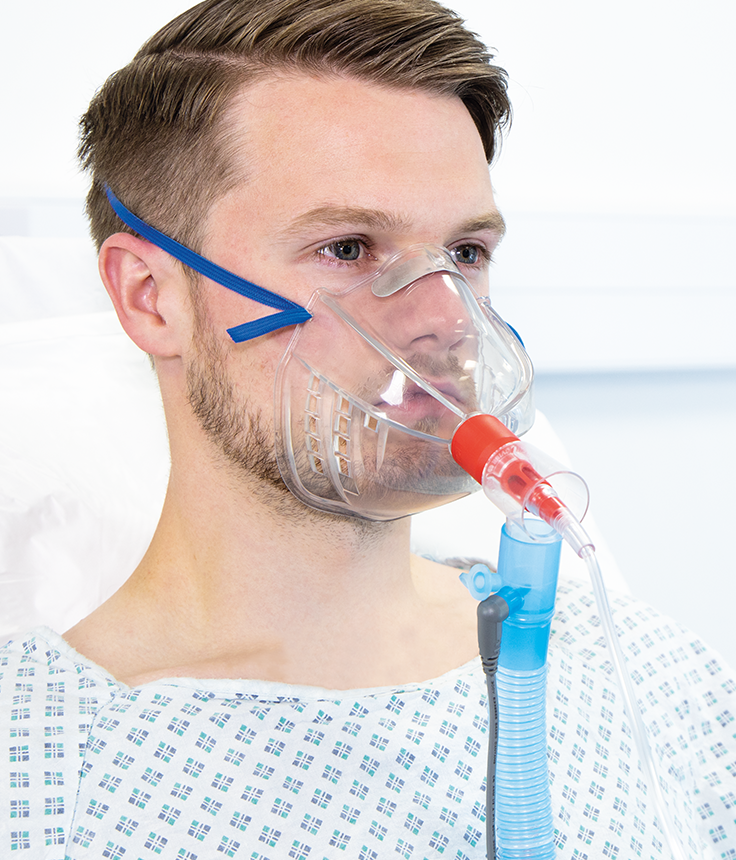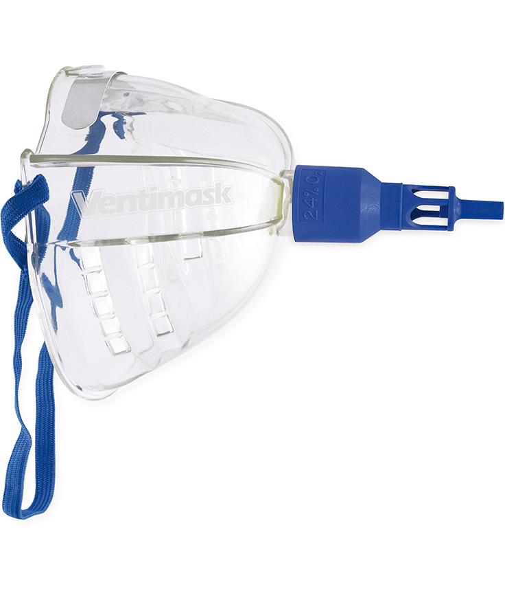 Venturi azul 24%. 2 LPM. Ventimask® es una máscara de oxigenoterapia clínicamente comprobada para proveer una concentración de oxígeno fija y predecible bajo condiciones de patrones ventilatorios variables que se pueden encontrar en la práctica clínica, un estándar aceptdo para la oxigenoterapia controlada con suministro exacto, desempeño óptimo y mayor aceptación por parte del paciente. La máscara tiene una capacidad de 280ml necesaria para funcionar como reservorio de oxígeno y maximizar la precisión, mientras mejora la adecuación del paciente. Además, es suave y flexible para sellar sin presión excesiva y permite un flujo de aire horizontal para minimizar irritación y resequedad en los ojos. En los costados, tiene una serie de aperturas que permiten el lavado de CO2 y previenen el aumento de presión adentro de la máscara.