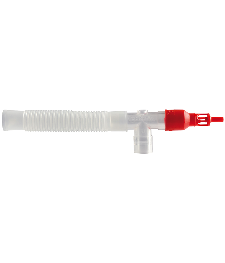 Con bolsa y Venturi rojo (40%). Conector en T de Oxigenoterapia posoperatoria que administra FiO2 40% a pacientes en recuperación con máscara laríngea in situ. Disponible con bolsa para evaluar respiración del paciente, sin reinhalación ni dilución de O2. Una vez se retira la máscara laríngea, se reemplaza con máscara en kit rentable. La administración de O2 posoperatorio al 40% ha sido demostrado como la concentración ideal para incrementar la tensión de oxígeno en hemoglobina, disminiur el período de recuperación, mejorar la curación de las lesiones y reducir el riesgo de infecciones.