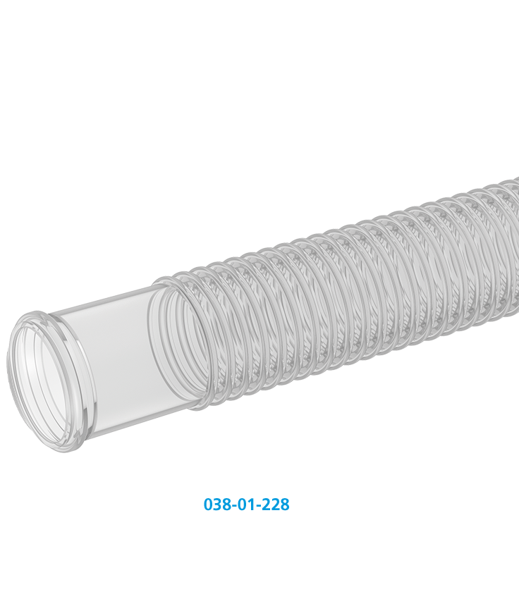 Tubo corrugado de 22mm de diámetro y 50m de longitud con tramos cada 45cm de igual calidad a los demás circuitos respiratorios y de anestesia de Flexicare, con baja compliance y alta resistencia al flujo, acoplado a una alta resistencia al colapso.