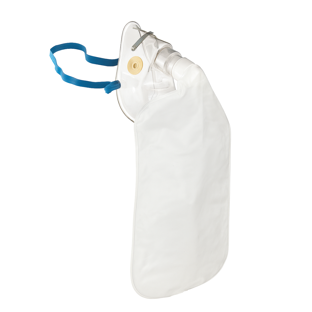 Máscara de oxígeno sin reinhalación con bolsa de reservorio, cinta elástica para cabeza y línea de O?, está diseñada para suministrar una elevada concentración de oxígeno de hasta un 80%.