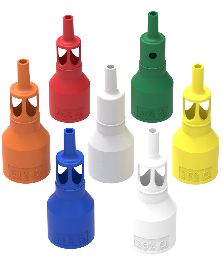 Adulto con clip nasal. La máscara de aerosol para adultos, dotada de un kit de máscara de Venturi múltiple o de una selección de 6 Venturis, constituye una opción cómoda y rentable para satisfacer las necesidades de cada paciente individual cuando sea necesario cambiar la concentración requerida durante la ruta del tratamiento de oxigenoterapia. Se puede utilizar con un nebulizador o con tubos corrugados de 22mm para una humidifcación y oxigenoterapia combinadas. Presentan un puente nasal integrado y una cinta de tela elástica para mayor seguridad y, en tamaños adultos, disponen de un clip nasal.