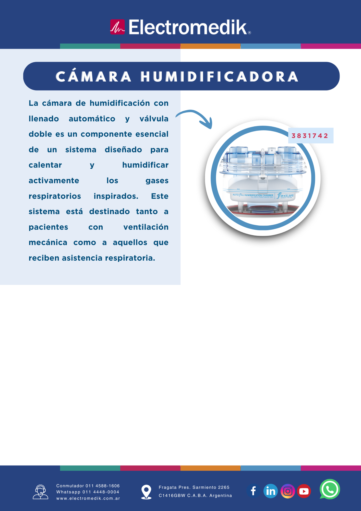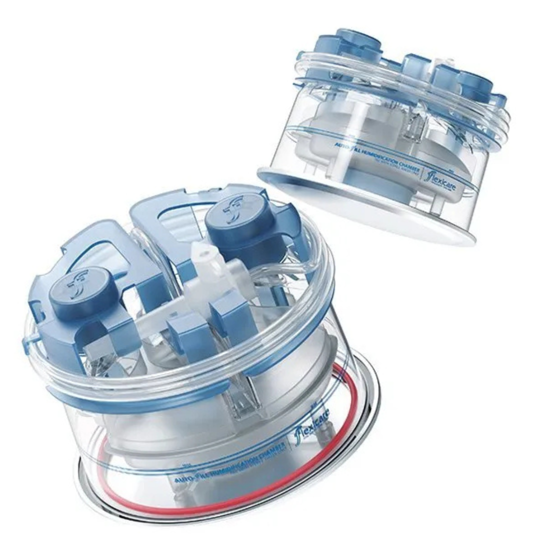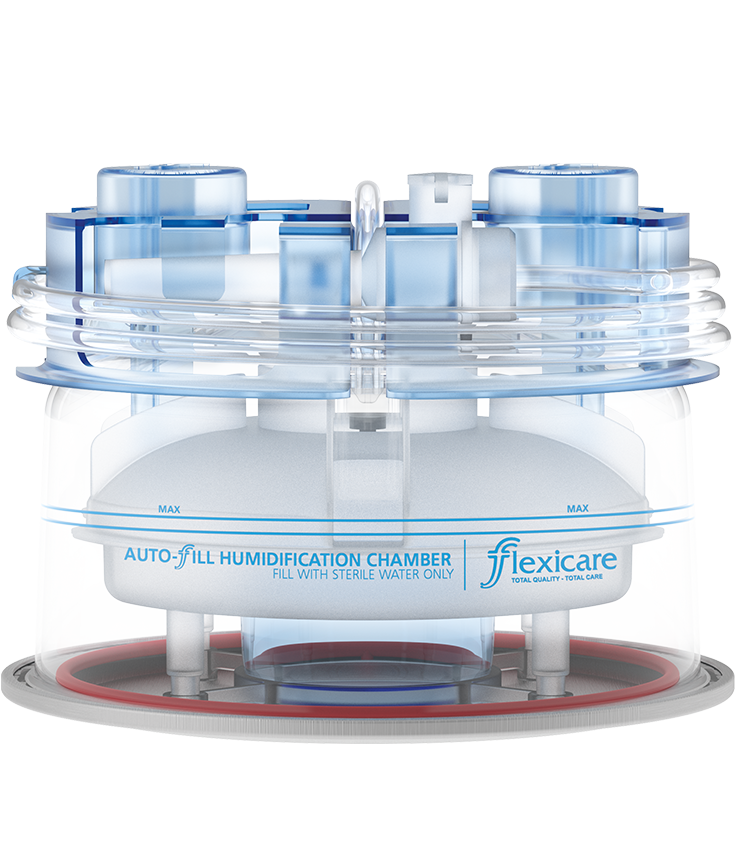Carcasa Humidificadora con llenado automático Flexicare, diseñada para sistemas de ventilación y asistencia respiratoria, calienta y humedece activamente los gases administrados al paciente. Con llenado automático que reduce la intervención manual, válvula doble para evitar sobrellenado, capacidad reducida para optimizar agua, desviadores de flujo que aseguran distribución homogénea y base de aluminio que aporta estabilidad y durabilidad. Su construcción transparente con indicador flotante rojo y marcas de graduación claras facilitan el control del nivel de agua. Ideal para ventilación invasiva, no invasiva y administración de oxígeno, garantizando protección y eficacia durante el tratamiento respiratorio.