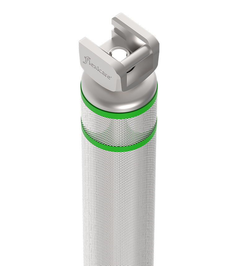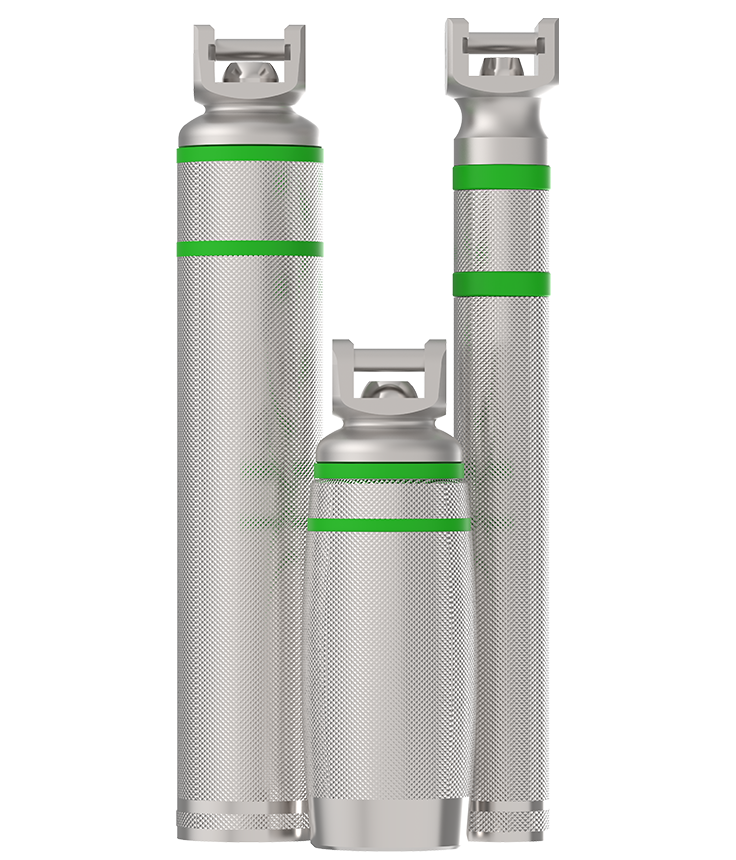 Mango de laringoscopio de fibra óptica, reutilizable. Cmpatible con todas las ramas de fibra óptica (identificado con banda verde). Incorpora iluminación LED de alta eficiencia energética para una visualización clara y confiable durante la intubación.
