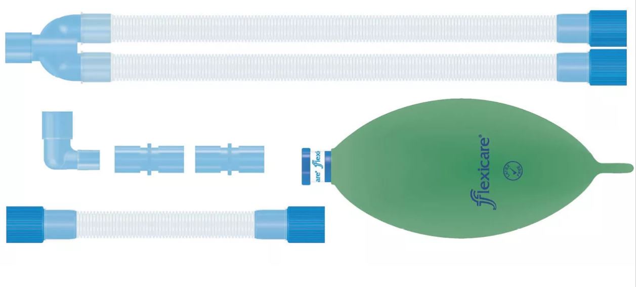 Paralelo básico (2,4m) con tubos corrugados ligeros y flexibles de 22mm, con conector en Y, conectores 22mm hembra, extensión de 0,8m, bolsa de reservorio de 2L, codo de bajo perfil y conector macho/macho de repuesto, con conector de bolsa con codo en ángulo fijo, compatible con la tecnología de sistemas de respiración avanzados (ABS).