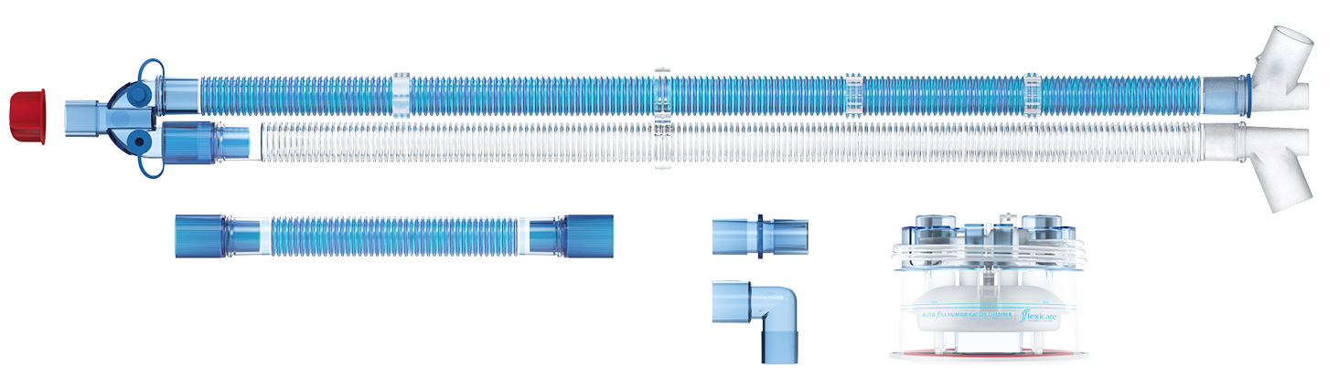 Sistema de respiración con doble cable calefactado de 22mm para adultos (1,6m), con conector en Y con puerto MDI y puerto de presión, extremo espiratorio con borde interno liso, línea de presión, extensión de 0,5 m, conector 22 macho/22 macho, conector 15 hembra de repuesto, codo 22 hembra/22 macho y cámara de llenado automático.
