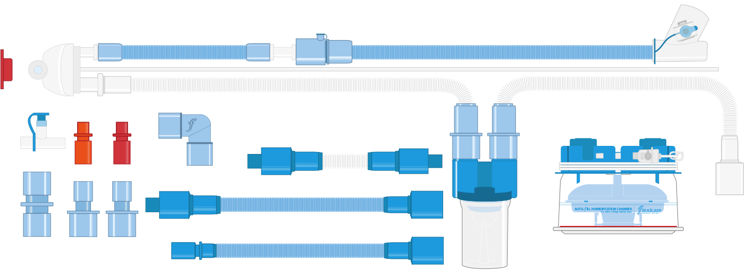 Sistema de respiración con cable simple calefactado de 15mm neonatal (1,6m), con conector en Y con puerto de succión, extensión de incubadora de 15mm de 0,3m, extremo espiratorio de tubo corrugado con trampa de agua, conectores en T con puerto, conectores 15 macho-22 macho/15 hembra, conector 8 macho/15 macho, tubo adaptadpr, codo 22 hembra/22 hembra, conectores 9-11 hembra/22 macho-15 hembra, conectores 10 macho-8 hembra/15 macho-11 hembra, adaptador de cable calefactado 15 hembra/22 hembra, línea de presión extraíble, extensión 0,15m 9-11 macho/9-11 macho, extensión 0,6m 22 hembra/22 hembra, extensión 0,6m 15 macho-11 hembra/22 hembra y cámara de llenado automático.