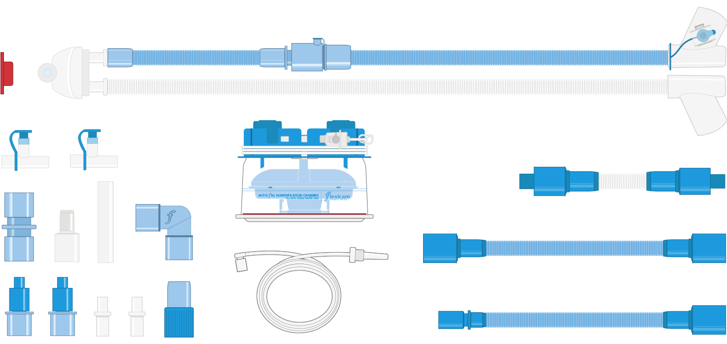Sistema de respiración con doble cable calefactado de 15mm neonatal (1,6m), con conector en Y con puerto de succión y línea de presión fija, extensión de incubadora de 10mm de 0,3m, extremo espiratorio de tubo corrugado, conector 22 macho/22 macho, conector 15 hembra de repuesto, conector en T con puerto, codo 22 hembra/22 macho, conectores 15 macho-22 macho/15 hembra, restrictores de flujo rojo y ámbar, extensión 0,15m 9-11 hembra/9-11 hembra, extensión 0,6m 9-11 hembra/22 hembra y cámara de llenado automático.