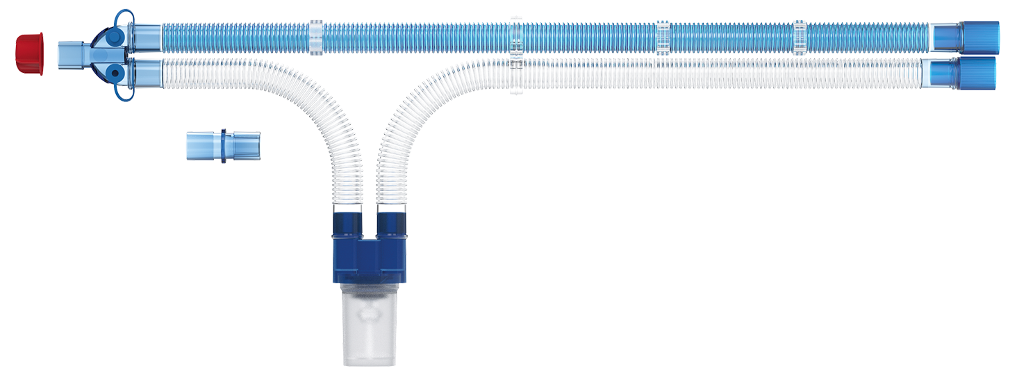 Sistema de respiración de 22mm estándar para adultos (1,6m) de tubo corrugado con conector en Y dotado de puerto, conectores 22mm hembra, conector 22 mm macho/macho de repuesto, con extensión de 0,8m y trampa de agua con autocierre.
