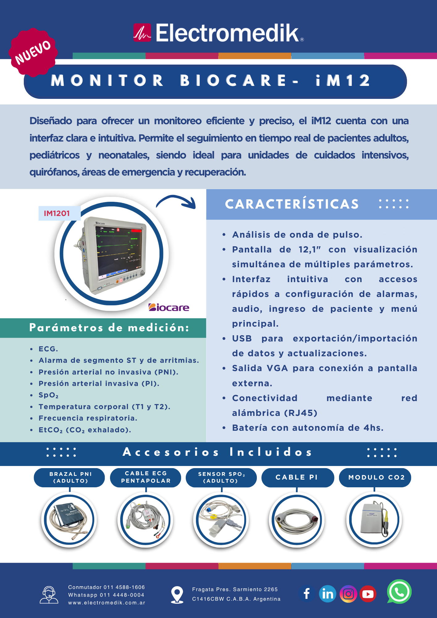 El monitor multiparamétrico iM12 está diseñado para ofrecer un monitoreo eficiente y preciso en pacientes adultos, pediátricos y neonatales, siendo ideal para unidades de cuidados intensivos, quirófanos, áreas de emergencia y recuperación. Incorpora una pantalla LCD a color de 12,1 pulgadas de alta resolución que permite la visualización simultánea de múltiples parámetros, con una interfaz clara e intuitiva que facilita el acceso rápido a la configuración de alarmas, ingreso de paciente, audio y menús principales. Ofrece medición de ECG con análisis y alarmas de arritmias y segmento ST, presión arterial no invasiva e invasiva, frecuencia respiratoria, saturación de oxígeno, temperatura dual y EtCO?, con la posibilidad de almacenar tendencias gráficas y tabulares de hasta 480 horas, registros de presión arterial y eventos de alarmas, además de conservar dos horas de formas de onda de ECG para su revisión. Integra análisis de onda de pulso y distintos cálculos clínicos (medicación, hemodinámicos, función renal, oxigenación y ventilación), lo que lo convierte en una herramienta versátil para el personal médico. Dispone de conectividad mediante USB, salida VGA y red RJ45, con opción de conexión inalámbrica a central de monitoreo. Su batería recargable de ion-litio de carga rápida asegura hasta 10 horas de autonomía con doble batería. Entre sus opciones se incluyen capnografía con diferentes tecnologías, saturación de oxígeno de baja perfusión Masimo®, medición de gases anestésicos y gasto cardíaco, además de pantalla táctil, impresora y soportes fijos o móviles, lo que le otorga gran adaptabilidad a diferentes entornos hospitalarios.