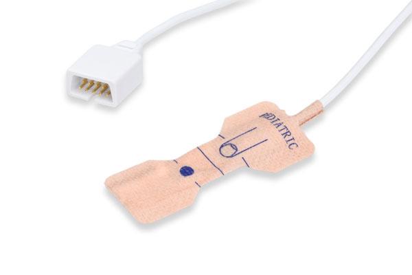 Sensor de saturación periférica de oxígeno descartable pediátrico para pacientes entre 10-50kg, de colocación recomendada en el dedo de la mano. Compatible con tecnología Nellcor Convencional.
