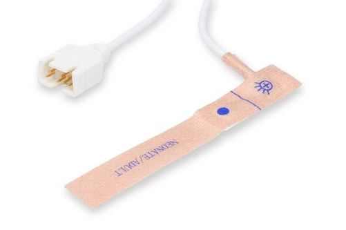 Sensor de saturación periférica de oxígeno descartable neonatal-adulto para pacientes menores a 3kg o mayores a 40kg, de colocación recomendada en el pie del neonato o en el dedo de la mano adulta. Compatible con tecnología Masimo de conector DB9.