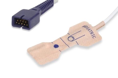 Sensor de saturación periférica de oxígeno descartable pediátrico para pacientes entre 10-50kg, de colocación recomendada en el dedo de la mano. Compatible con tecnología Nellcor OxiMax.