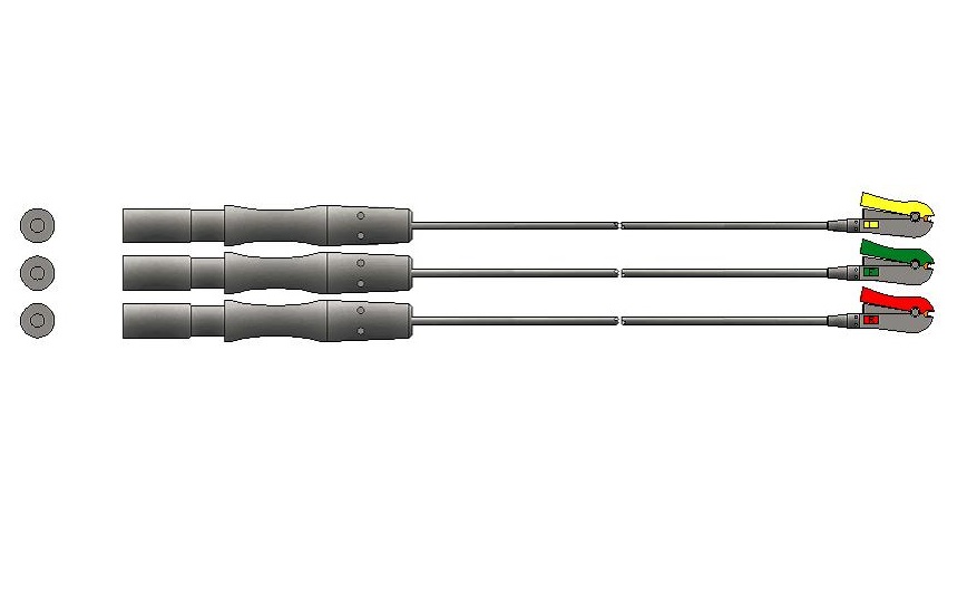 Los elementos de interfase de conexión para electrodos descartables, son cables de alta flexibilidad que garantizan conexiones seguras aún durante el movimiento de los pacientes. Vienen en configuración tripolar con código de color Americano (AHA) (blanco(RA), negro(LA), rojo(LL) y poseen terminales para electrodo Grabbers (tipo pinza)