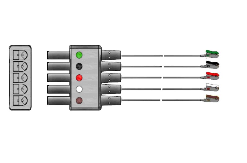 Los elementos de interfase de conexión para electrodos descartables, son cables de alta flexibilidad que garantizan conexiones seguras aún durante el movimiento de los pacientes. Vienen en configuración pentapolar con código de color Americano (AHA) (blanco(RA), negro(LA), verde(RL), rojo(LL), marrón(V) y poseen terminales para electrodo Grabbers (tipo pinza)