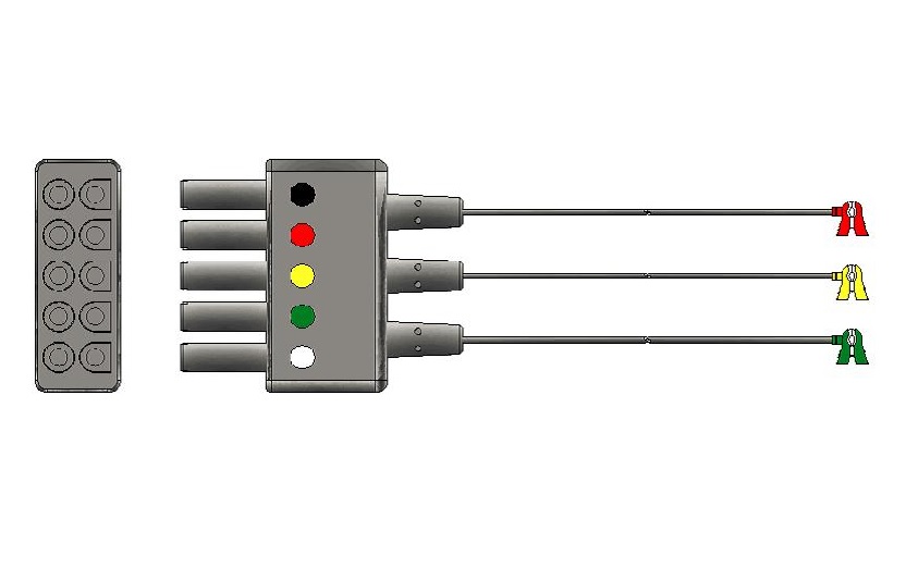 Los elementos de interfase de conexión para electrodos descartables, son cables de alta flexibilidad que garantizan conexiones seguras aún durante el movimiento de los pacientes. Vienen en configuración tripolar con código de color Americano (AHA) (blanco(RA), negro(LA), rojo(LL) y poseen terminales para electrodo mini Grabbers (tipo pinza miniatura (neonatal))