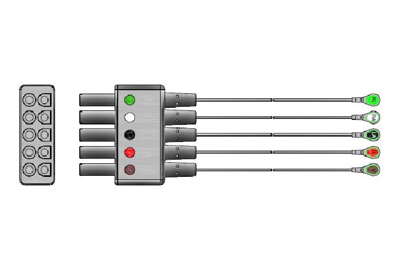 Los elementos de interfase de conexión para electrodos descartables, son cables de alta flexibilidad que garantizan conexiones seguras aún durante el movimiento de los pacientes. Vienen en configuración pentapolar con código de color Americano (AHA) (blanco(RA), negro(LA), verde(RL), rojo(LL), marrón(V) y poseen terminales para electrodo tipo ?Snap? (convencional)