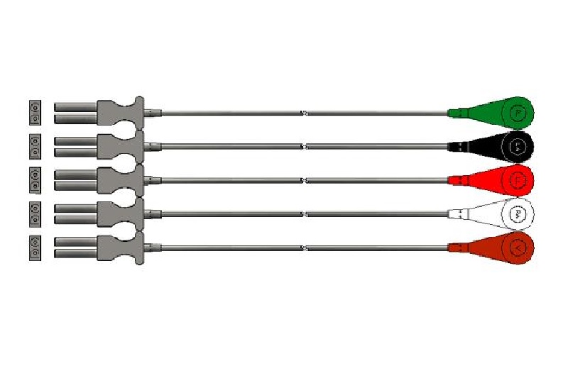 Los elementos de interfase de conexión para electrodos descartables, son cables de alta flexibilidad que garantizan conexiones seguras aún durante el movimiento de los pacientes. Vienen en configuración pentapolar con código de color Americano (AHA) (blanco(RA), negro(LA), verde(RL), rojo(LL), marrón(V) y poseen terminales para electrodo tipo ?Snap? (convencional)