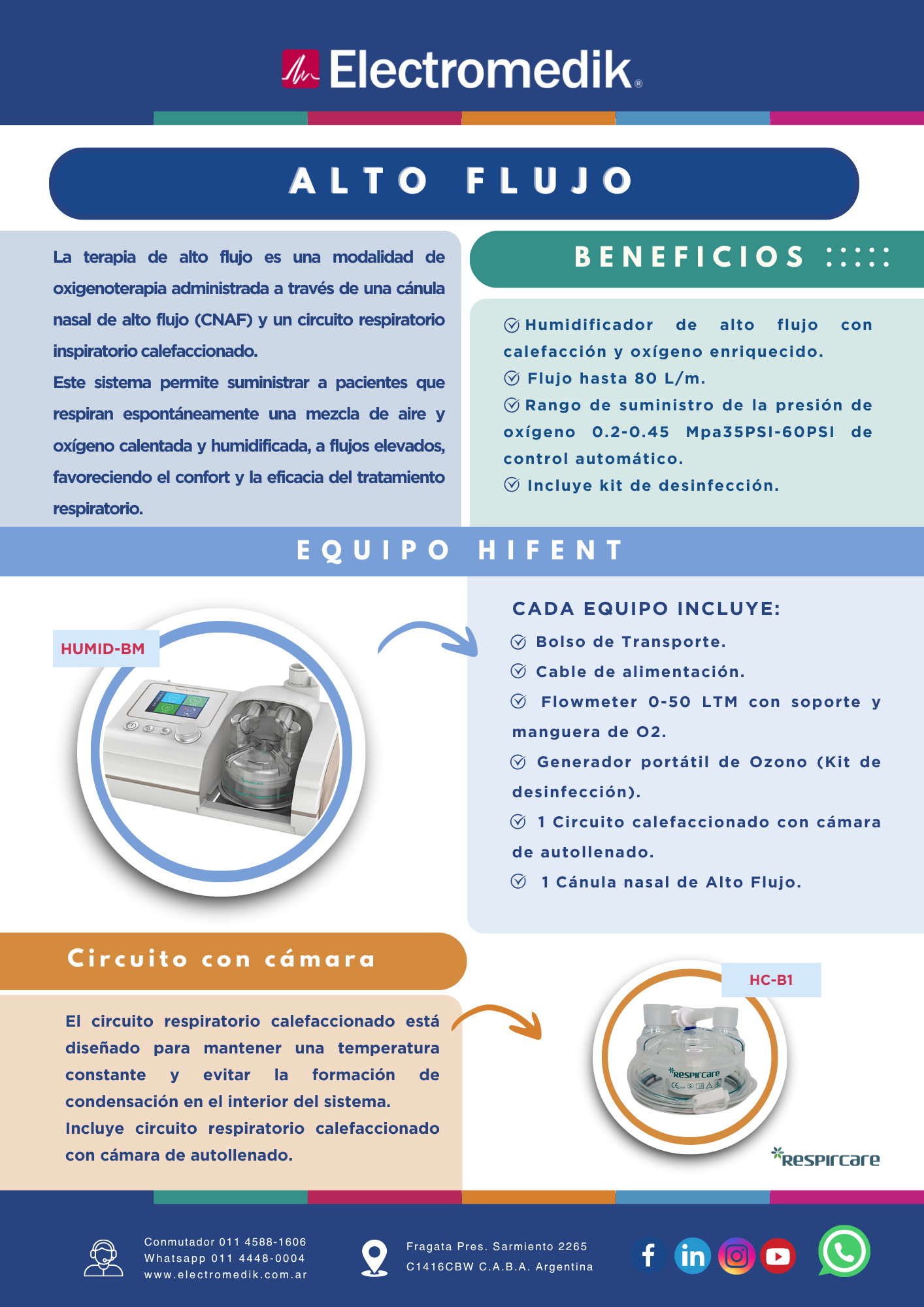 Incluye circuito respiratorio calefaccionado con cámara Respircare AIRT-B4, bolso de transporte, cable de alimentación, flowmeter 0-50 LPM con soporte y manguera de O2, generador portátil de ozono (kit de desinfección), 1 circuito calefaccionado con cámara de autollenado Respircare HC-B1 y 1 cánula nasal de alto flujo.