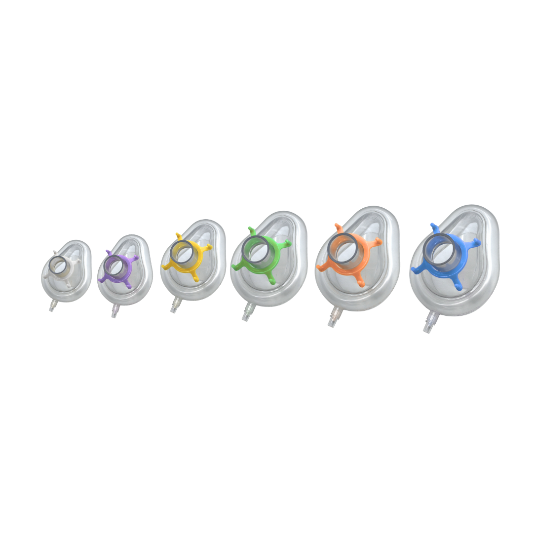Máscara facial para anestesia disponible varios tamaños, desde neonatales hasta adultos grandes, con broches codificados por colores para una identificación rápida y precisa. Incorpora un resorte de plástico que asegura una mejor adaptación al rostro del paciente, garantizando comodidad y un sellado eficaz. Compatible con todos los montajes de catéter y sistemas de respiración estándar gracias a sus conectores universales de 22 mm y 15 mm.