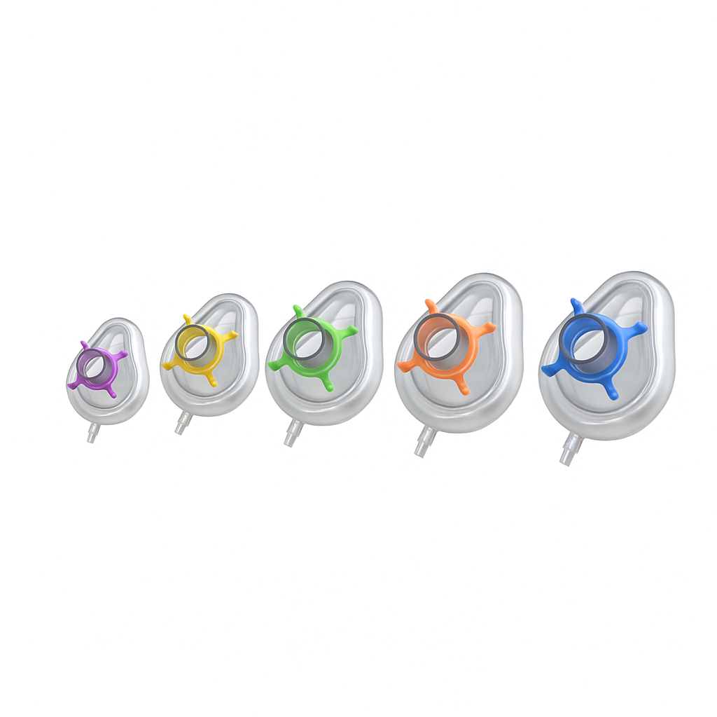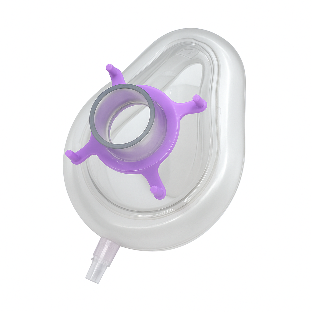 Máscara facial para anestesia disponible varios tamaños, desde neonatales hasta adultos grandes, con broches codificados por colores para una identificación rápida y precisa. Incorpora un resorte de plástico que asegura una mejor adaptación al rostro del paciente, garantizando comodidad y un sellado eficaz. Compatible con todos los montajes de catéter y sistemas de respiración estándar gracias a sus conectores universales de 22 mm y 15 mm.