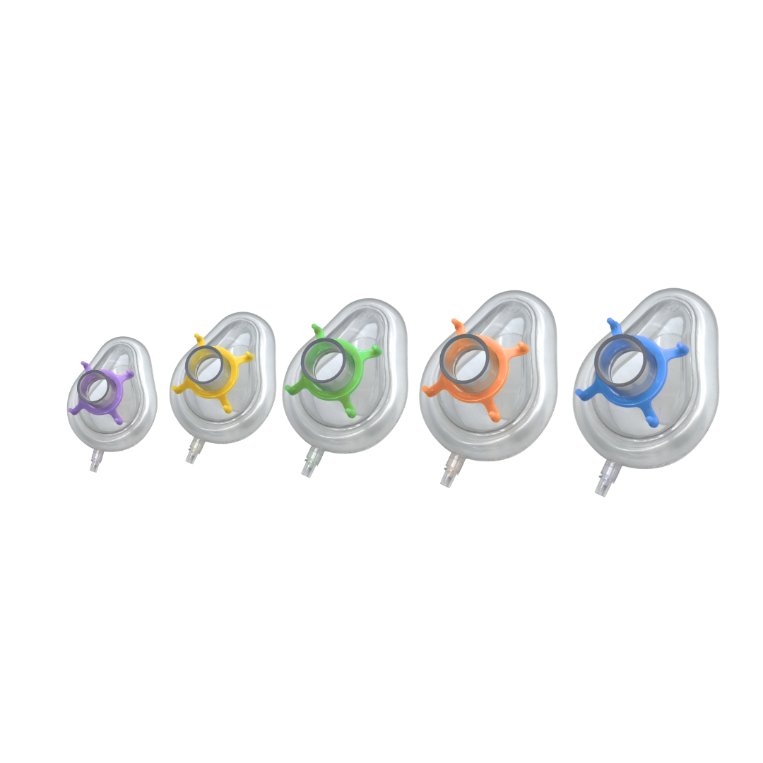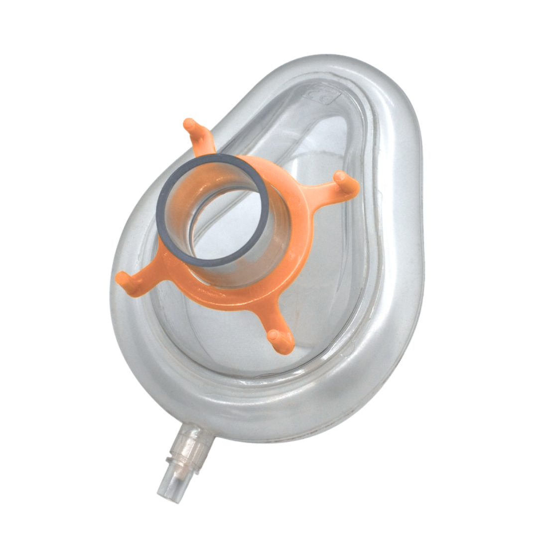 Máscara facial para anestesia disponible varios tamaños, desde neonatales hasta adultos grandes, con broches codificados por colores para una identificación rápida y precisa. Incorpora un resorte de plástico que asegura una mejor adaptación al rostro del paciente, garantizando comodidad y un sellado eficaz. Compatible con todos los montajes de catéter y sistemas de respiración estándar gracias a sus conectores universales de 22 mm y 15 mm.
