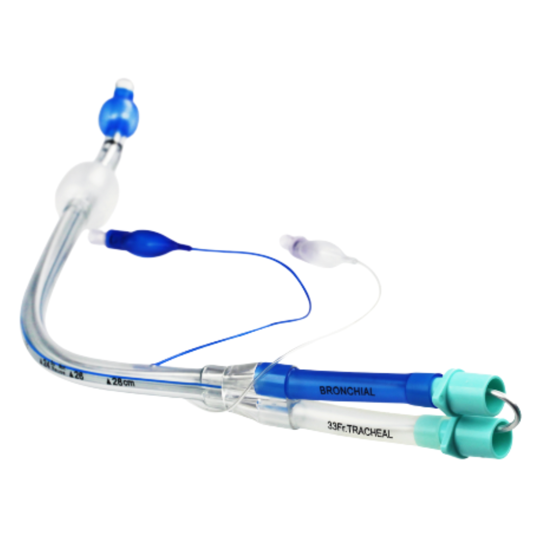 Dispositivo estéril de un solo uso, diseñado para la ventilación pulmonar y el aislamiento de un pulmón durante cirugías torácicas. Permite construir una vía aérea artificial unilateral o bilateral y administrar ventilación controlada, con conexión a equipos de respiración mecánica mediante su conector multifunción. Fabricado en silicona biocompatible, libre de látex y ftalatos, con dos lúmenes (traqueal y bronquial) y balones diferenciados para aislamiento seguro. Incluye estilete para inserción, tres sondas de aspiración, conector en Y y línea radiopaca para fácil visualización en rayos X. Ideal para manejo respiratorio en procedimientos complejos donde se requiere ventilación separada de cada pulmón.