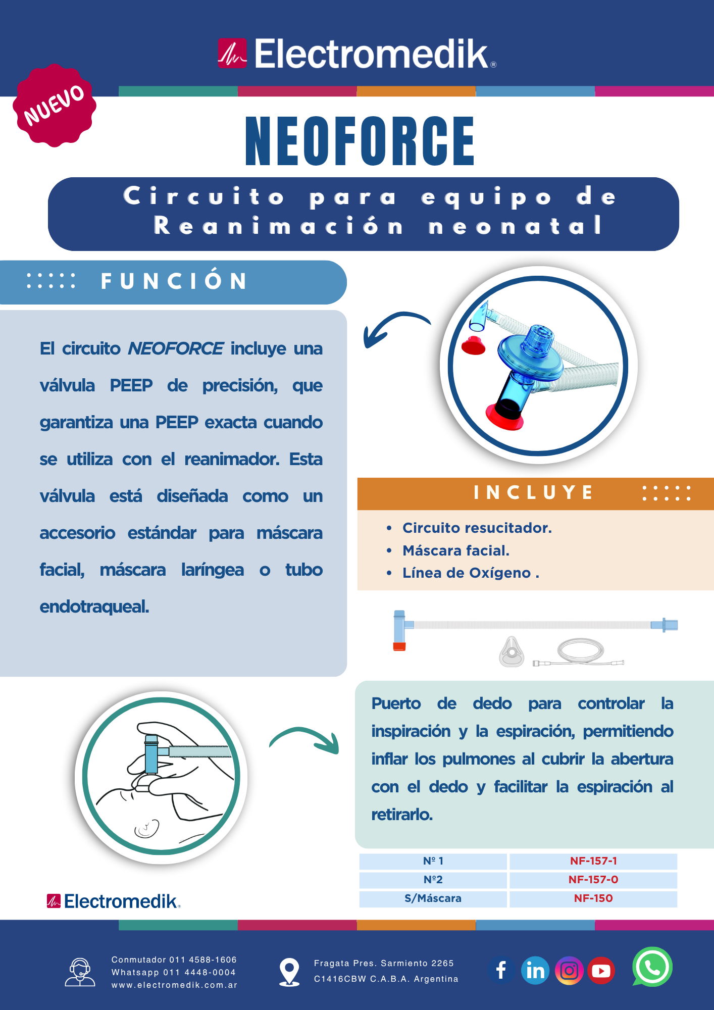 El circuito para equipo de reanimación neonatal NEOFORCE incluye una válvula PEEP de precisión, que garantiza una PEEP exacta durante la reanimación, adaptándose de forma segura a máscara facial, máscara laríngea o tubo endotraqueal.