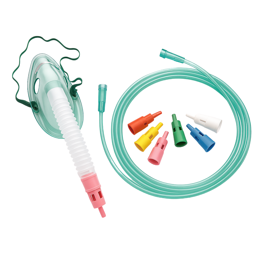 Máscara de oxígeno Venturi diseñada para regular con exactitud la concentración de oxígeno (FiO2) que recibe el paciente, gracias a sus válvulas de diferentes colores que permiten entregar concentraciones específicas de oxígeno entre 24% y 50%, asegurando una terapia precisa y segura.